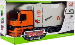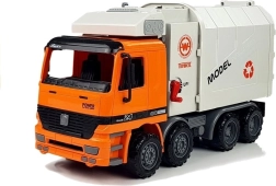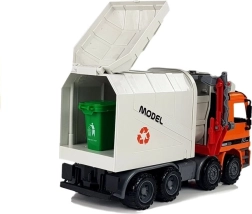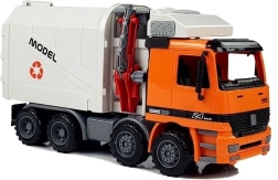 Duża śmieciarka w pomarańczowo-białych barwach oferuje realistyczną zabawę w segregację odpadów. Solidne wykonanie, otwierany kontener i napęd cierny gwarantują płynną jazdę oraz mnóstwo akcji przy załadunku i wyładunku. Otwarta kabina pozwala posadzić figurki kierowcy i pasażera (nie są częścią opakowania).