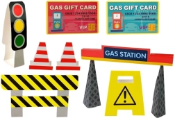 - Stacja paliw, 2 autka (betoniarka i wóz strażacki), akcesoria drogowe (sygnalizator, znaki, pachołki, bariera), 2 „karty”