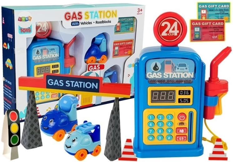 Zabawna dziecięca stacja paliw w niebiesko‑żółtej kolorystyce zapewnia realistyczną zabawę w tankowanie autek. Oferuje efekty świetlne i dźwiękowe, angielskie komunikaty głosowe, slot na karty płatnicze oraz licznik litrów po naciśnięciu rączki. W zestawie znajdują się 2 uśmiechnięte autka (betoniarka i wóz strażacki z drabiną), znaki drogowe, pachołki i inne akcesoria do niekończącej się kreatywnej zabawy.