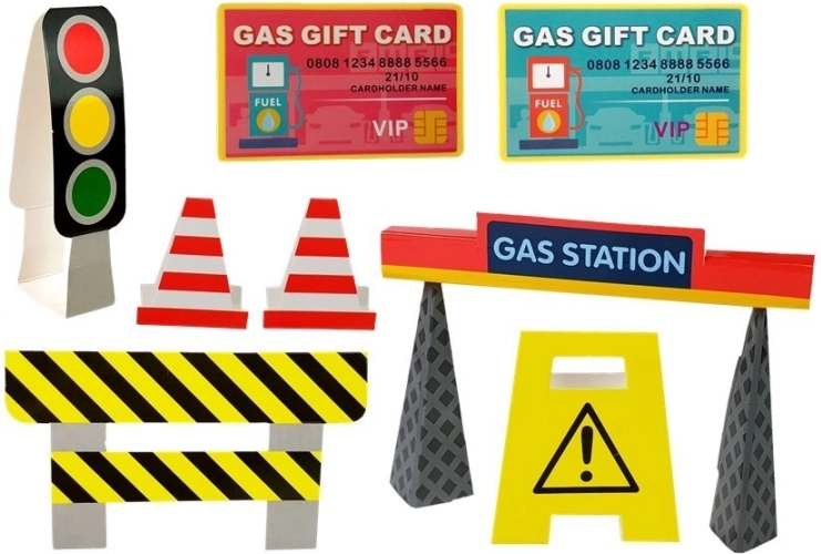 Opakowanie zawiera także 2 plastikowe autka z miłymi minami – betoniarkę i wóz strażacki z drabiną – oraz zestaw akcesoriów do zbudowania małej „stacji benzynowej” w domu. Dzieci łatwo ułożą własne scenki z sygnalizatorem, znakami i barierami.