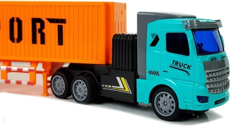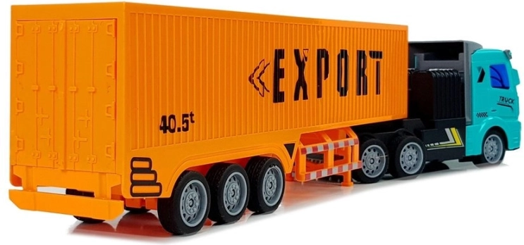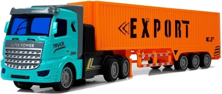 Turkusowa kabina i pomarańczowa naczepa z napisami EXPORT/PORT tworzą wierny wygląd prawdziwej ciężarówki – idealny do wyobrażeniowego transportu ładunków.