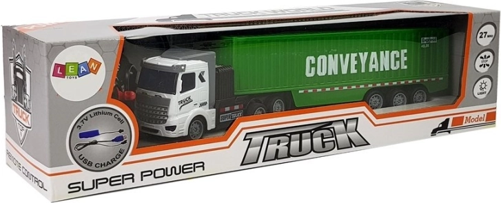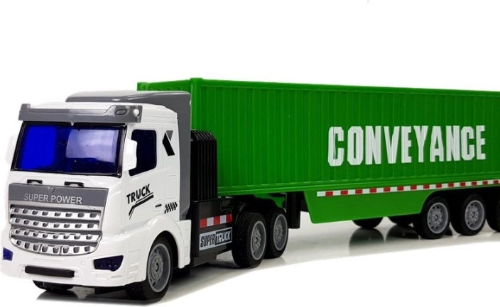 Ta zdalnie sterowana ciężarówka wiernie odwzorowuje prawdziwy pojazd drogowy – biała kabina, zielona naczepa i charakterystyczne detale przyciągają wzrok od pierwszego spojrzenia. Proste sterowanie dwoma joystickami umożliwia jazdę przód/tył oraz skręcanie w prawo/lewo, a podczas jazdy do przodu kabinę rozświetlają niebieskie diody LED.