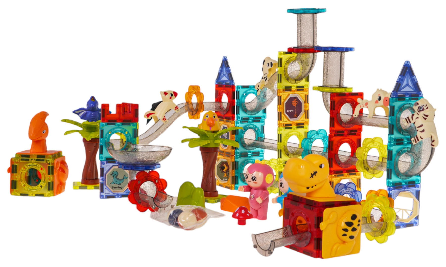 Zestaw kolorowych magnetycznych klocków z motywem ZOO, dla dzieci od 3 lat. Zestaw składa się ze 153 elementów i pozwala zbudować tor kulkowy w dowolnym układzie. Klocki wykonane są z najwyższej jakości tworzywa, gładkie i starannie wykończone. Łączą się za pomocą wbudowanych magnesów. Magnesy bardzo dobrze trzymają i zapewniają stabilność konstrukcji. W zestawie znajduje się ilustrowana instrukcja budowy przykładowych torów. . |