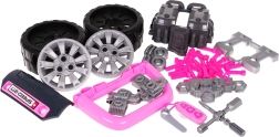 61 elementów: przednia część pojazdu z rozbieralnym silnikiem, koła z kołpakami, składany mini lewarek, śrubki, narzędzia, pilot–kluczyki, dekoracyjne naklejki, instrukcja