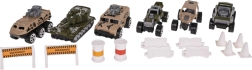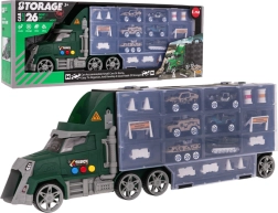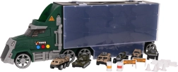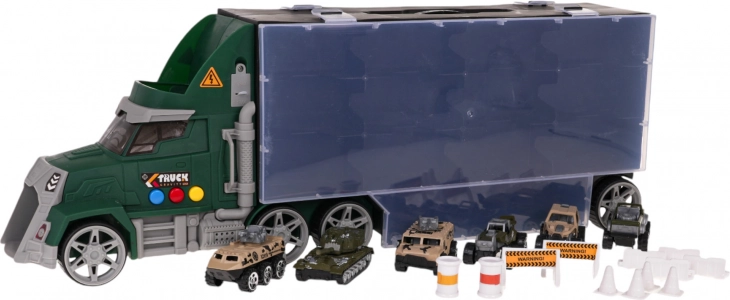 W zestawie znajduje się 6 metalowych/sprężynowych autek typu „resorak” oraz bogate akcesoria (pachołki, płotki, bariery, beczki) do budowy własnych torów przeszkód i wojskowych scenariuszy. Praktyczny uchwyt do przenoszenia ułatwi dziecku zabranie ciężarówki wszędzie ze sobą.