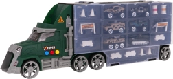 Ten interaktywny wojskowy pojazd zapewnia dzieciom godziny fantazyjnej zabawy i praktyczne przechowywanie. Po bokach naczepy znajdziesz otwierane schowki na autka i akcesoria, a na dachu kabiny zjeżdżalnię dla autek. Kabina świeci i dzięki przyciskom odtwarza dźwięki startu, klakson oraz wesołą melodię.