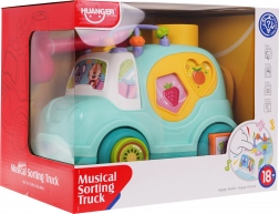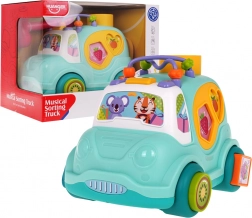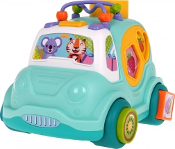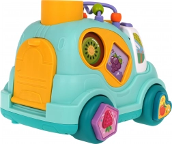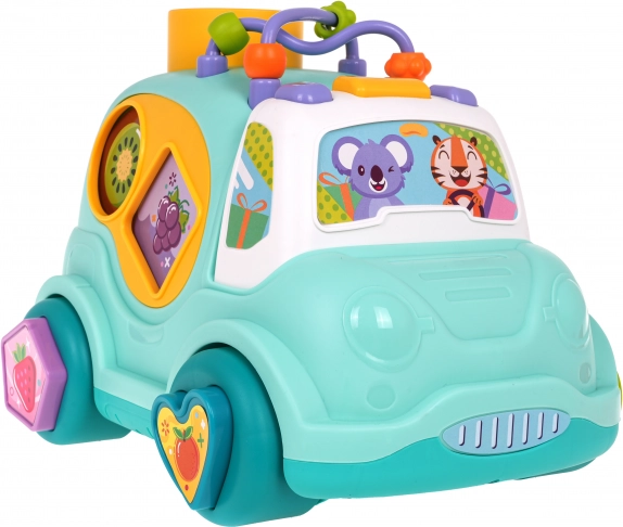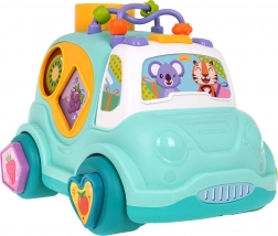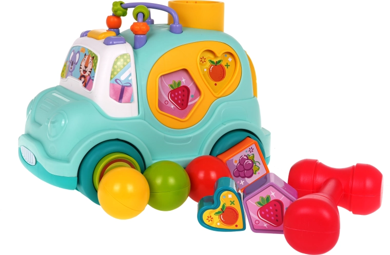 Ten kolorowy autobus zapewnia dzieciom godziny zabawy i nauki w jednym. Po bokach i na kołach znajdują się otwory do sortowania kształtów, a na dachu otwór na piłeczki, które można z radością wbijać do środka młoteczkiem. Piłeczki mają w środku grzechotki, dzięki czemu zabawa jest jeszcze ciekawsza i bardziej stymulująca sensorycznie.