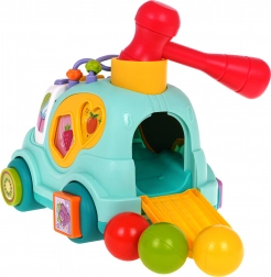 Na dachu znajduje się otwór na piłeczki. Dzieci mogą wbijać je do środka za pomocą młoteczka, a następnie wyjąć przez tylne drzwiczki. Piłeczki w środku grzechoczą.