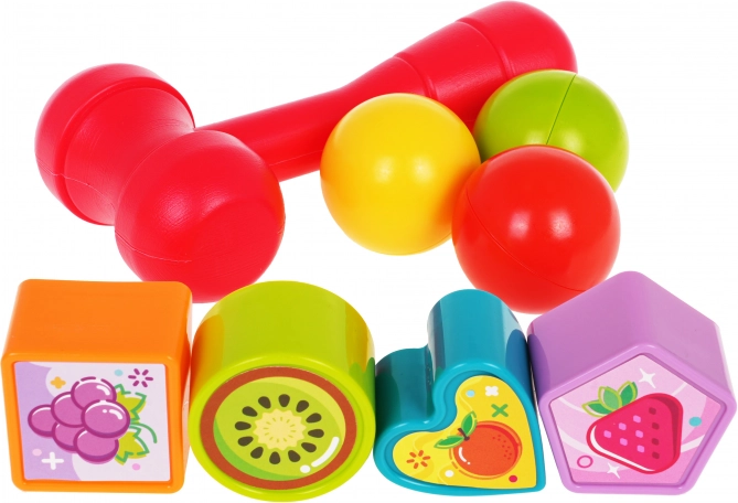 - Bogate wyposażenie: 4 klocki, 3 grzechoczące piłeczki i młoteczek