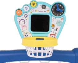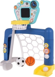 Interaktywny zestaw piłkarski, koszykarski i golfowy 3 w 1, dla dzieci od 18 miesięcy. Na panelu znajdują się trzy przyciski do przełączania między trybami. Zabawka zasilana 3 bateriami AA 1,5 V (nie dołączono do zestawu). .Tryby zabawki: . - Przycisk FUN: dzieci słuchają poleceń do wykonania, a następnie je naśladują, .- Przycisk RUCH: uruchamia obrazki na tablicy wraz z dźwiękami i muzyką, .- Przycisk WYŁĄCZ: maluch kontroluje wyniki na tablicy. .Funkcje zabawki: . - odpowiednia dla dzieci powyżej 18 miesięcy, .- 3 gry do wyboru: golf, koszykówka, puszka z piłeczką; różne możliwości zabawy, .- zegar z ruchomymi wskazówkami do nauki godzin, .- kółka zębate do ćwiczenia precyzji, .- przeplatanki, .- interaktywny panel z efektami dźwiękowymi i świetlnymi. |
