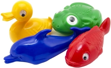 - 4 pływające zwierzątka: kaczuszka, delfin, żabka, rybka