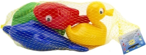 - żółta kaczuszka, niebieski delfin, zielona żabka, czerwona rybka