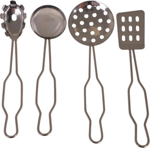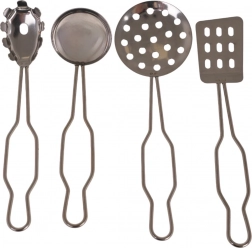 W zestawie znajdują się także szczypce, chochla, łopatka i łyżka cedzakowa – wszystko, czego dzieci potrzebują do gotowania i serwowania.