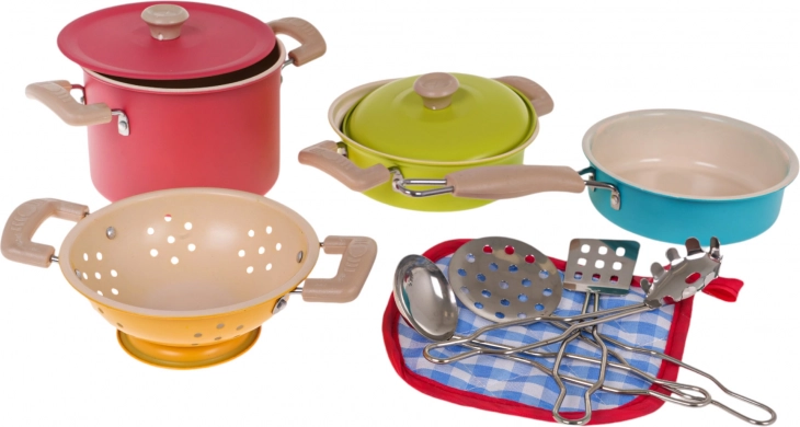 Ten kolorowy zestaw dziecięcych naczyń wnosi autentyczne wrażenia z gotowania do każdej dziecięcej kuchni. Dwa garnki z pokrywkami, patelnia, durszlak i cztery praktyczne przybory kuchenne zapewniają wszystko, czego dzieci potrzebują do naśladowania prawdziwego gotowania. Dzięki metalowym materiałom zestaw jest solidny, trwały i gotowy na codzienną zabawę.