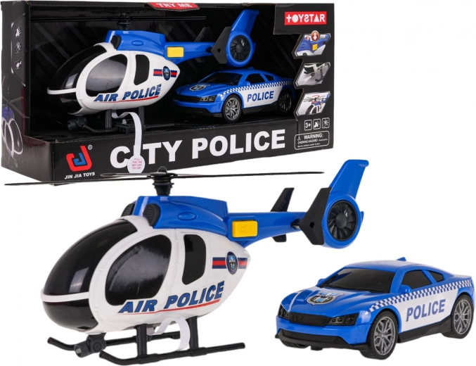 Zabawny policyjny zestaw dla małych stróżów prawa zawiera szczegółowy helikopter i sportowy samochód. Helikopter oferuje efekty świetlne i dźwiękowe, ręcznie obracane wirniki i jest zasilany bateriami AG13 (w zestawie). Policyjne auto ma gumowe opony i napęd na wolne koło dla płynnej jazdy. Idealny dla dzieci od 3 lat.