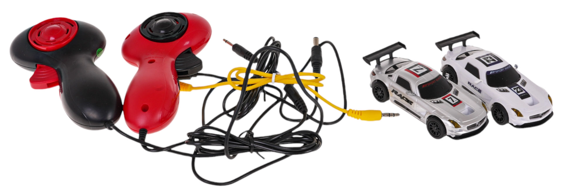 - elementy konstrukcyjne toru, .- 2 pojazdy, .- 2 piloty zdalnego sterowania, - kabel zasilającego adaptera USB . |