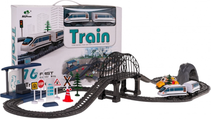 - Kompletny zestaw 76 elementów – tory, pociąg, stacja, most, tunel, TAXI, znaki, drzewa i inne dodatki.