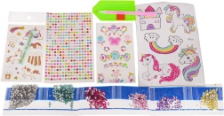 Zestaw zawiera naklejki z jednorożcami, błyszczące kryształki i szablony. Dzieci tworzą oryginalny design i rozwijają małą motorykę oraz kreatywność.
