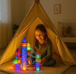 Odkryj kreatywny zestaw dla dzieci od 3 lat – magnetyczne klocki i przezroczyste rurki do budowy torów kulkowych ze świetlnymi efektami. Zestaw 134 elementy oferuje elementy LED, projektor gwiazd, reflektory, a nawet napędzaną windę dla kulek. Rozwija małą motorykę, wyobraźnię przestrzenną i kreatywność – zabawa i nauka w jednym.