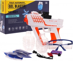 Zestaw zawiera pistolet, okulary ochronne, dwa magazynki na żelowe kulki, cztery paczki kulek, akumulator do ładowania oraz kabel USB.