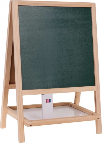 Dwustronna drewniana tablica jest idealna do kreatywnej zabawy i nauki dla dzieci powyżej 3 lat. Z jednej strony dzieci mogą używać markera, natomiast druga strona służy do rysowania kredą. Tablica jest magnetyczna po obu stronach, co umożliwia mocowanie magnetycznych literek, cyfr, znaków działań matematycznych i brył. Praktyczna półeczka na dole tablicy ułatwia przechowywanie wszystkich dołączonych akcesoriów.