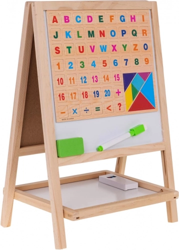 Drewniana dwustronna tablica dla dzieci od 3 lat. Jedna strona jest biała do rysowania markerem, druga czarna do rysowania kredą. Tablica jest magnetyczna po obu stronach i zawiera litery, cyfry oraz figury geometryczne na magnesach.