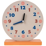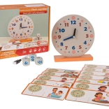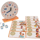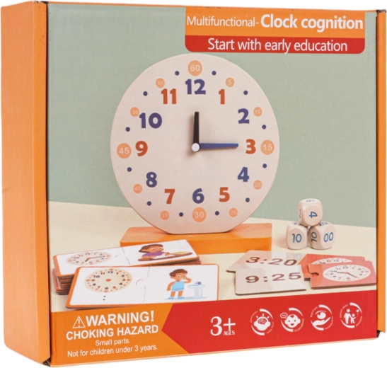 Edukacyjny zestaw Zegar z akcesoriami został zaprojektowany tak, aby dzieci łatwo zrozumiały pojęcie czasu. Zawiera duży drewniany zegar z ruchomymi wskazówkami, trzy kostki z różnymi wartościami czasu oraz 24 dwustronne elementy do układania. Dzieci mogą uczyć się odczytywania godzin, ćwiczyć pamięć i koncentrację — wszystko w formie zabawy.