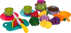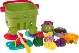 Zawiera koszyk z pokrywką, deskę do krojenia, noże, garnki, patelnie, kubeczki i inne kuchenne akcesoria do realistycznej zabawy.