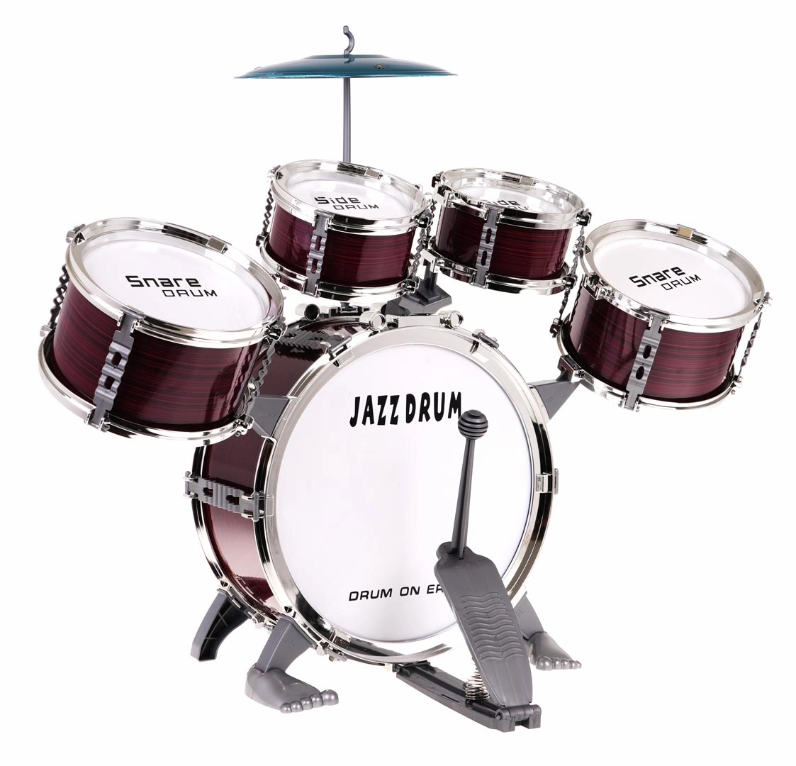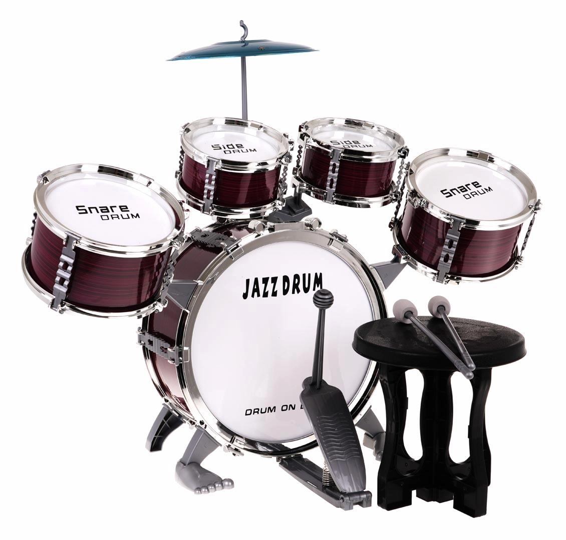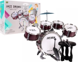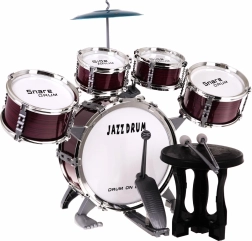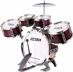 Zawiera wszystkie potrzebne elementy: pięć bębnów, talerz, pałeczki i stołek.