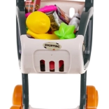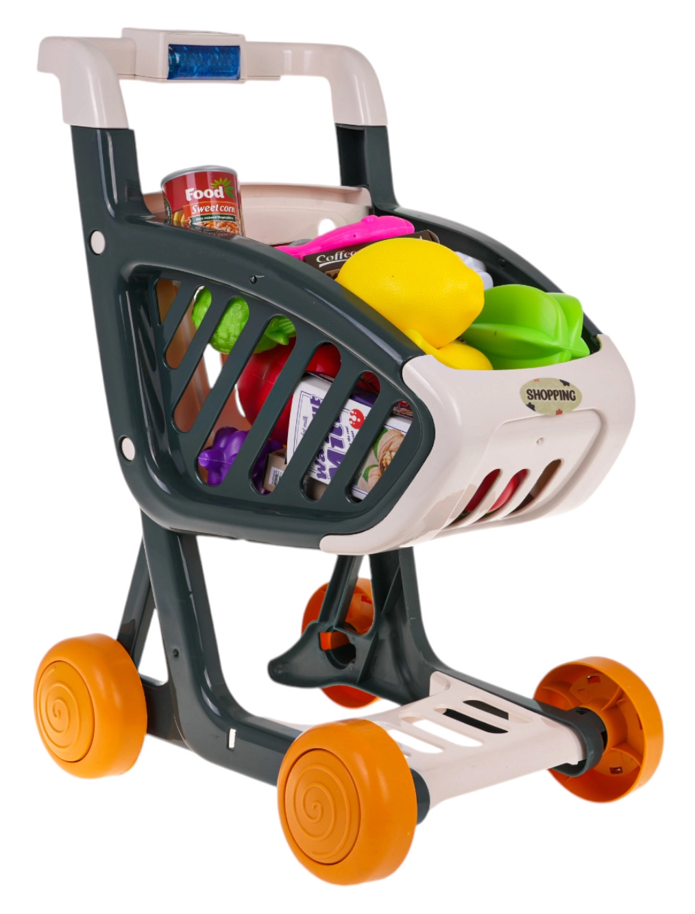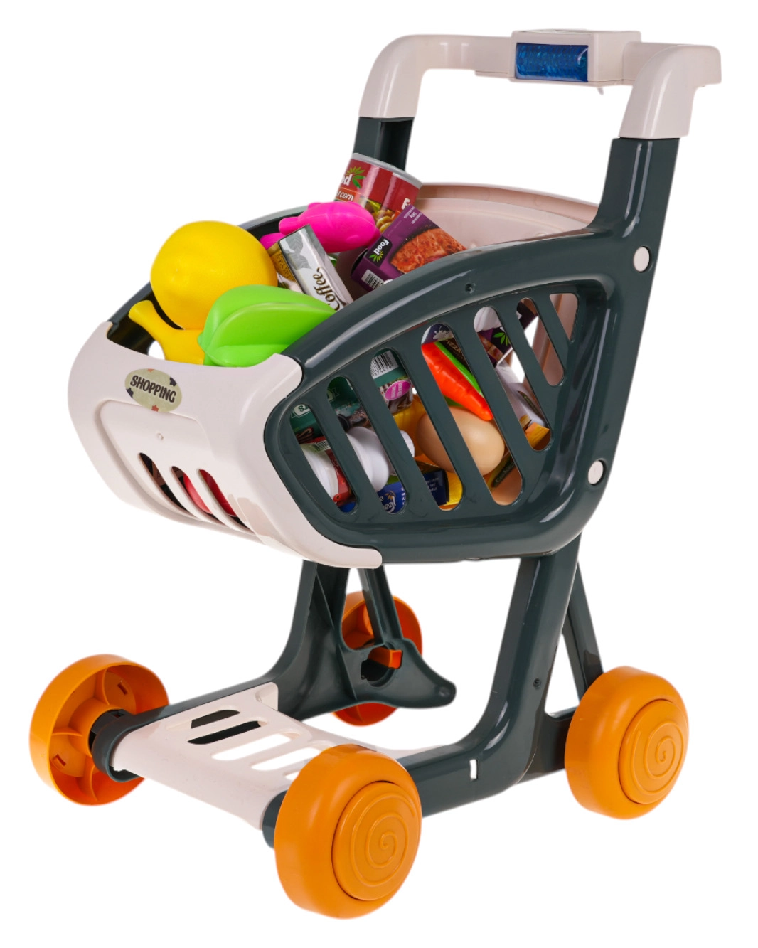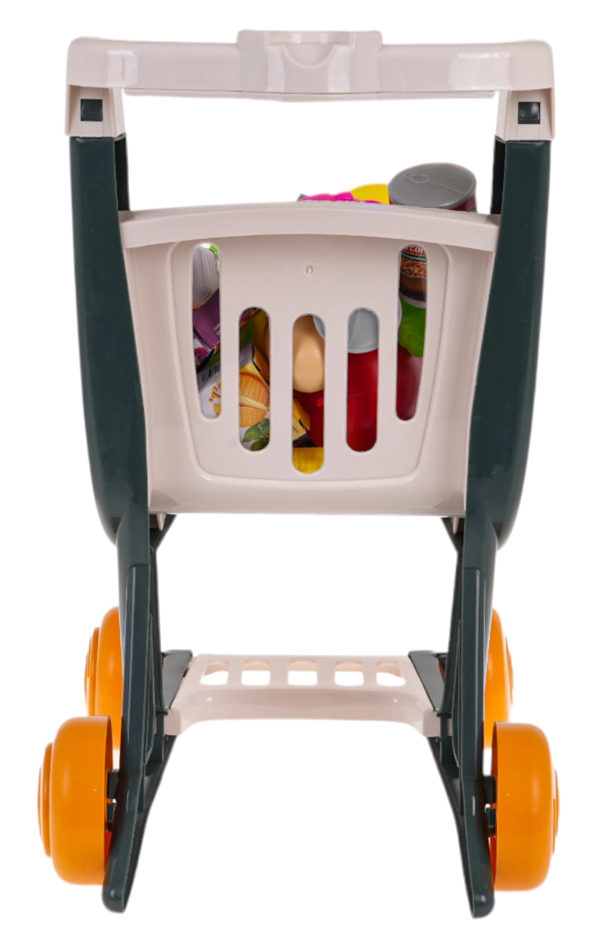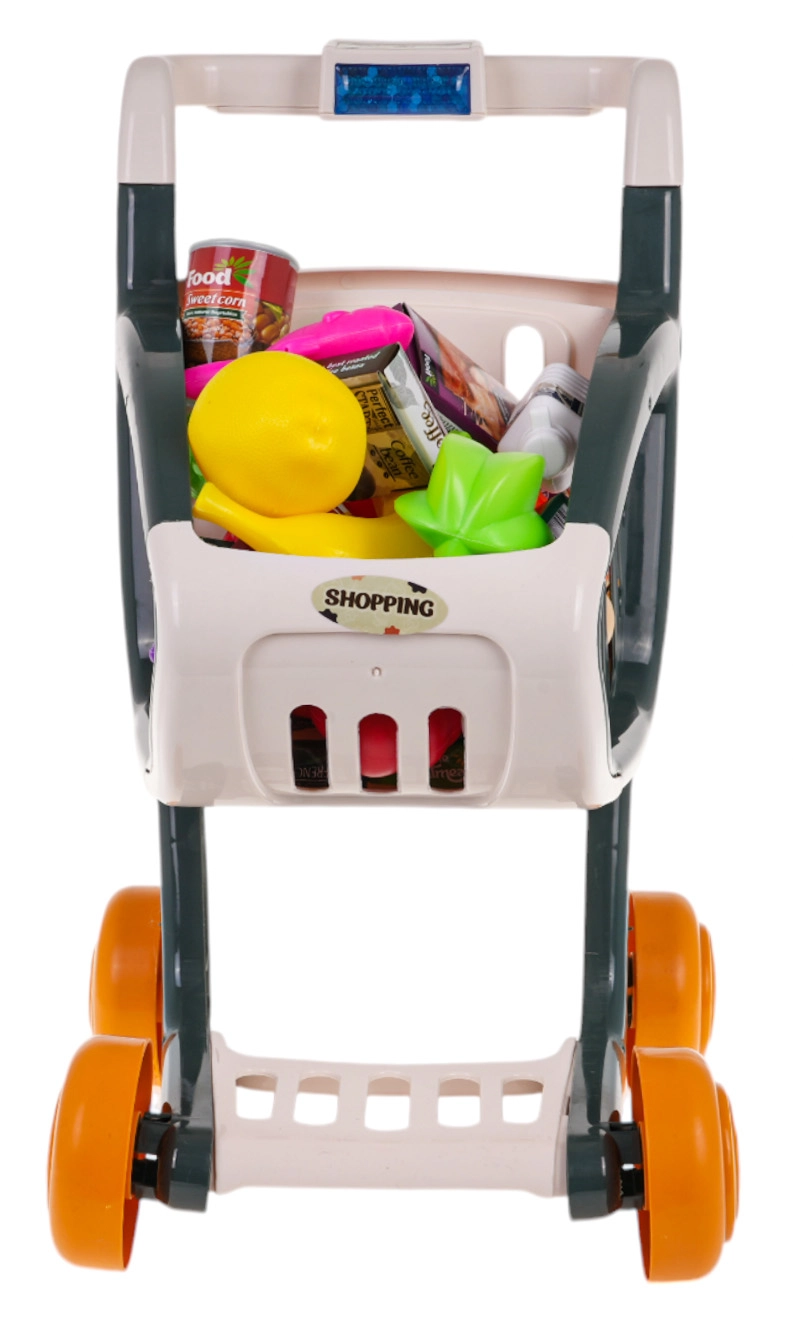 Interaktywny wózek zakupowy dla dzieci od 3 lat zapewnia mnóstwo zabawy i nauki. Ma stabilną konstrukcję, obrotowe kółka oraz panel sterowania ze światłami i muzyką. Po naciśnięciu niebieskiego przycisku zapalają się migające diody LED (zielona, czerwona, niebieska) i rozbrzmiewają wesołe piosenki. W zestawie znajduje się 41 akcesoriów do realistycznej zabawy w zakupy. Baterie 3× AG13 są w zestawie.