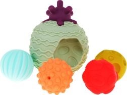 Dzięki możliwości wkładania mniejszych kul do większej dzieci uczą się rozpoznawania kształtów i kolorów.