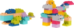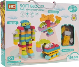 Zestaw zawiera 126 miękkich klocków wykonanych z bezpiecznego materiału PVC, bez ostrych krawędzi i lekkich w manipulacji. Klocki zaprojektowano w żywych kolorach, które zachwycą i pobudzą dziecięcą wyobraźnię. Są bardzo łatwe w utrzymaniu: po wygotowaniu zachowują kolor, można je zginać, a następnie wracają do pierwotnego kształtu.