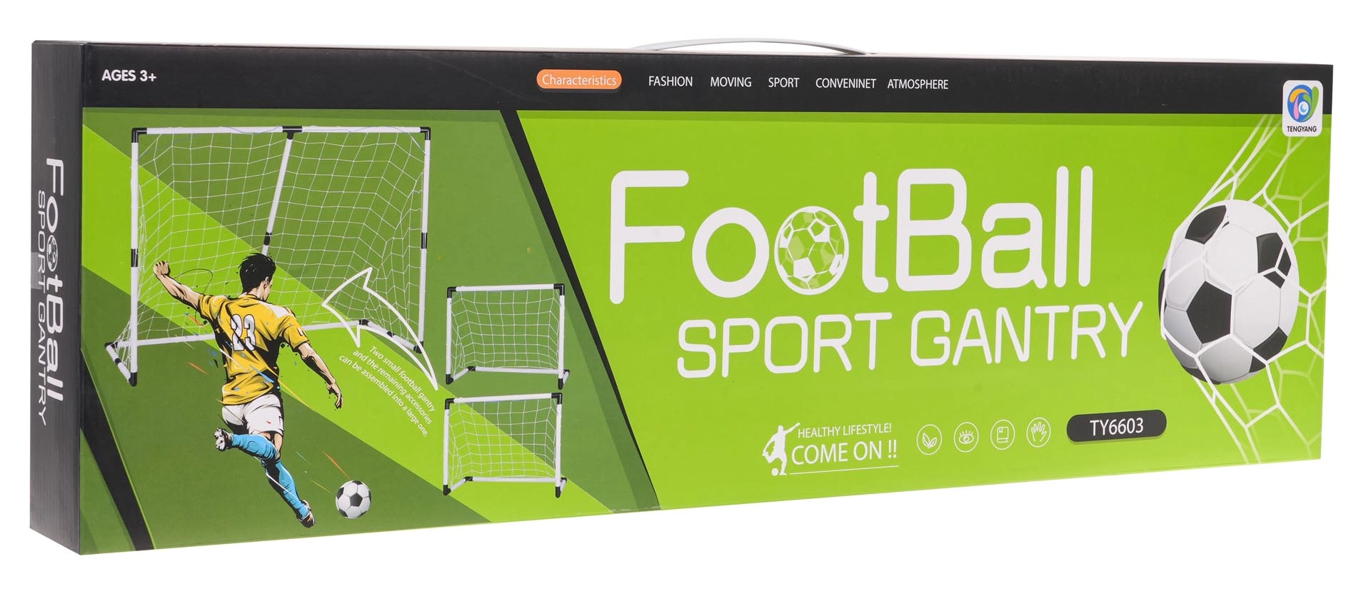 - duża bramka ok. 143 cm x 110 cm x 70 cm, .- mała bramka ok. 74 cm x 56 cm x 35 cm, .- piłka dmuchana ok. 13 cm, .- opakowanie ok. 66,5 cm x 20,5 cm x 7 cm, . |