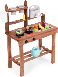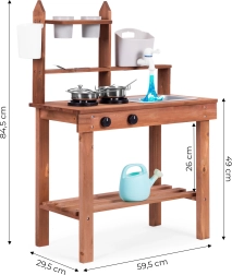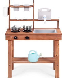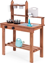 Wspiera zabawy w odgrywanie ról i pozwala dzieciom „gotować” z piasku, gliny czy kamyczków. Przejrzyste półki i haczyki utrzymują naczynia pod ręką, a kompaktowe wymiary ułatwiają ustawienie nawet w mniejszych przestrzeniach.