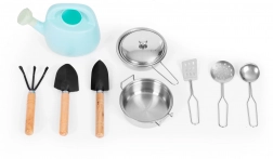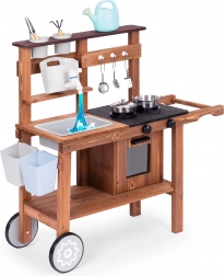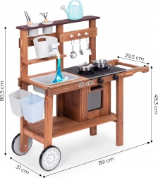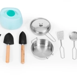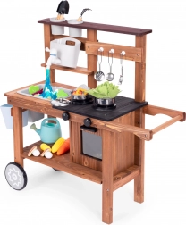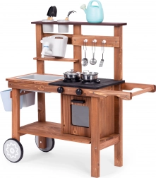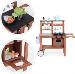 Przemyślane detale, takie jak działający kran, otwierane drzwiczki do szafki lub „piekarnika” oraz kółka z gumowym bieżnikiem dla delikatnego transportu, czynią z kuchni ulubione miejsce zabaw. Bogaty zestaw akcesoriów (garnek, patelnia, chochla, sitko, łopatka, konewka i narzędzia ogrodowe) pobudza wyobraźnię i wspiera samodzielną zabawę.