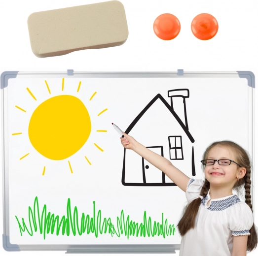 Dzięki kompaktowym wymiarom 45 × 60 cm sprawdzi się w mniejszych przestrzeniach – w korytarzu, pokoju dziecięcym, domowym biurze i salach konferencyjnych. Montaż jest łatwy dzięki zintegrowanym uchwytom, więc tablicę szybko i bezpiecznie umieścisz na ścianie.