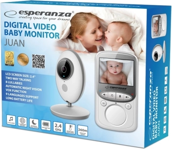 Zyskaj spokój i pewność z wideonianią Esperanza JUAN. Przejrzysty ekran LCD 2,4″, automatyczne nocne widzenie oraz czuły tryb VOX zapewniają wyraźny obraz i dźwięk zarówno w dzień, jak i w nocy. Dwukierunkowa komunikacja pozwala natychmiast uspokoić maluszka własnym głosem lub włączyć jedną z ośmiu kołysanek.