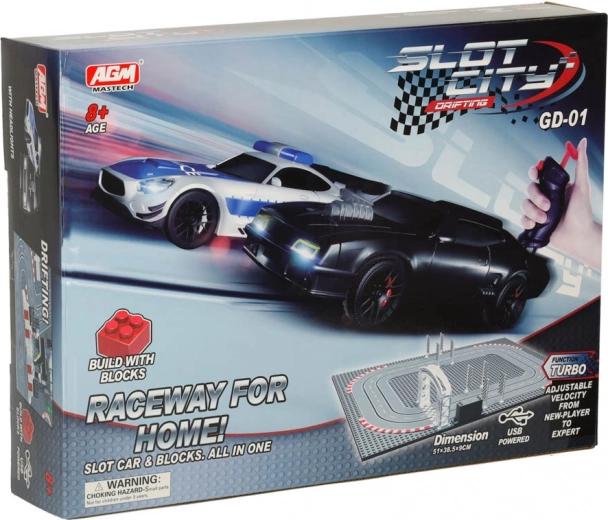 Elektryczny tor wyścigowy to ekscytująca zabawka, która przenosi dzieci do świata akcji pełnego wyścigów i policyjnych pościgów! Dzięki temu torowi Twoje dzieci staną się częścią fascynujących zmagań, sterując dwoma autkami – czarnym sportowym i radiowozem policyjnym. Zestaw zawiera osiem elementów, które po złożeniu tworzą tor z czterema zakrętami. Dwa autka poruszają się po torze, a dzieci kontrolują je za pomocą joysticków, precyzyjnie regulując prędkość pojazdów.