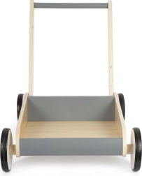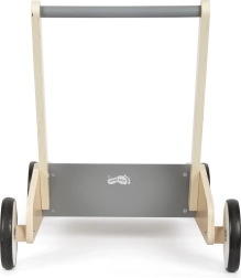 Odkryjcie niezawodnego towarzysza pierwszych kroków. Solidna konstrukcja z wysokiej jakości laminowanego drewna w połączeniu z łupkowo szarymi elementami zapewnia pewność, bezpieczeństwo i nowoczesny wygląd. Zaokrąglone krawędzie oraz gumowane koła są łagodne dla dziecięcych dłoni i podłóg, a system hamowania pomaga utrzymać komfortowe tempo nauki chodzenia.