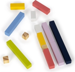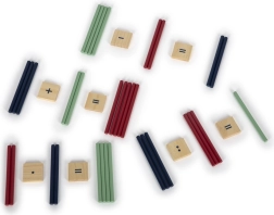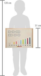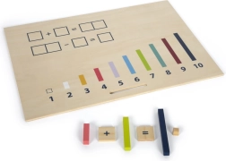 - Zawartość zestawu: podkładka do liczenia, kolorowe sześciany, prostopadłościany i patyczki, drewniane elementy z liczbami i znakami matematycznymi.