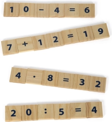 Drewniane płytki z równaniami i liczbami motywują dzieci do samodzielnego rozwiązywania i szybkiego powtarzania.