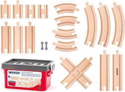 Praktyczny zestaw zawiera 20 sztuk drewnianych torów do kolejek, umieszczonych w wytrzymałym plastikowym pudełku dla łatwego przechowywania. Idealne rozszerzenie do dziecięcych kolejek, odpowiednie od 3 lat i z zgodnością CE.