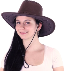 Stylowy kowbojski kapelusz dla dorosłych w brązowym kolorze z dekoracyjnymi przeszyciami doda Twojej stylizacji autentyczny westernowy wygląd. Zapewnia ochronę przed słońcem, ma oczka wentylacyjne dla komfortu, a dzięki solidnej konstrukcji dobrze trzyma kształt – idealny na karnawał, festiwale i na co dzień.