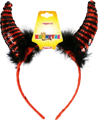 Rogi diabła z cekinami i piórami na satynowej opasce. Wyrazisty, wygodny dodatek na karnawał, Mikołajki i imprezy. Doda Twojemu kostiumowi uroku i charakteru.