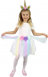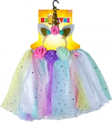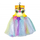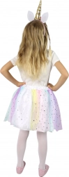 Zamień swoje dziecko w magicznego jednorożca dzięki temu kolorowemu kostiumowi, który zawiera spódniczkę tutu oraz opaskę z jednorożcem. Zestaw jest idealny dla dzieci, które chcą przeżywać baśniowe przygody podczas zabawy. Spódnica zdobiona jest kolorowym tiulem z motywem gwiazdek i została zaprojektowana tak, aby łatwo dopasowywała się dzięki elastycznej talii.