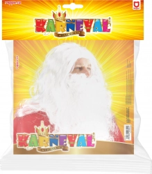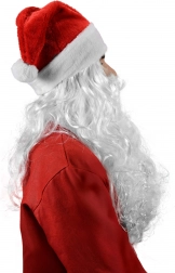Ta peruka z długą białą brodą i czapką tworzy tradycyjny wygląd Mikołaja.
