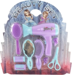 W zestawie znajduje się realistyczna suszarka na 2 baterie AA (brak w zestawie), grzebień, szczotka, 2 wałki, 2 spinki i nożyczki – wszystko dopasowane do dziecięcych rąk. Praktyczne opakowanie o wymiarach ok. 32 × 38 cm idealnie nadaje się na prezent.