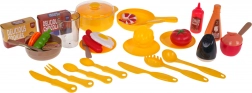 - patelnia, garnek z pokrywką, miska, miseczka z pokrywką, kubek, 3 × talerz, łopatka, chochla, nóż, widelec, łyżka, sztućce dla dzieci, przybory kuchenne, ketchup, dressing, solniczka, pudełka na ciastka, repliki żywności (papryka, pomidor, groszek, sałata, marchew, krewetka, jajko, parówki, ryba)