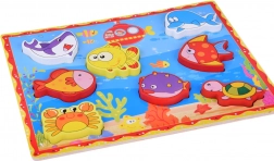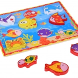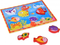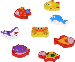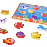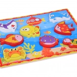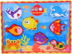 Dzieci w zabawny sposób uczą się rozpoznawać kształty i nazwy zwierząt, takich jak rekin, ryba, krab czy żółw. Wspiera zasób słownictwa i percepcję wzrokową.