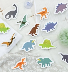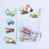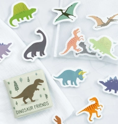 Zabawa w wannie bez bałaganu – 14 piankowych elementów z uroczymi dinozaurami po zamoczeniu przykleja się do ścian wanny lub płytek łazienkowych. Po kąpieli po prostu włóż je do woreczka z przyssawkami, który trzyma wszystko razem i pod ręką.